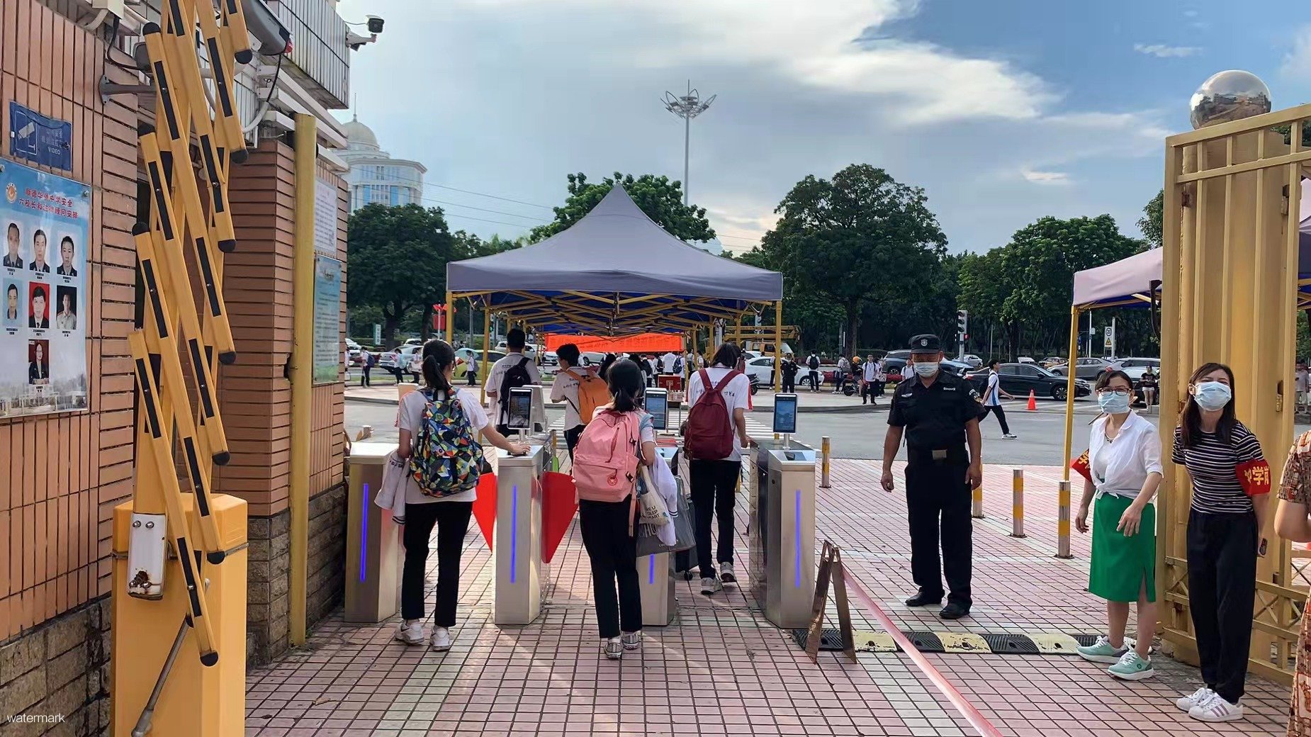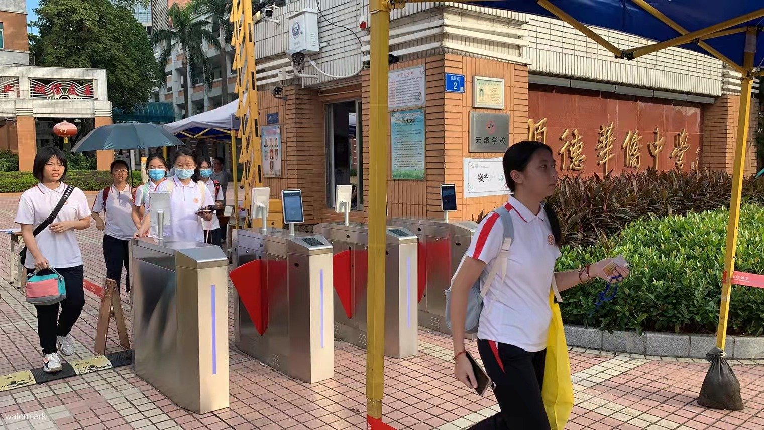 順德華僑中學在校園出入口安裝了深圳市鐵軍智能科技有限公司的人臉識別翼閘設備,通過即時獲取通行師生信息進行有效比對,防止非本校人員進出。