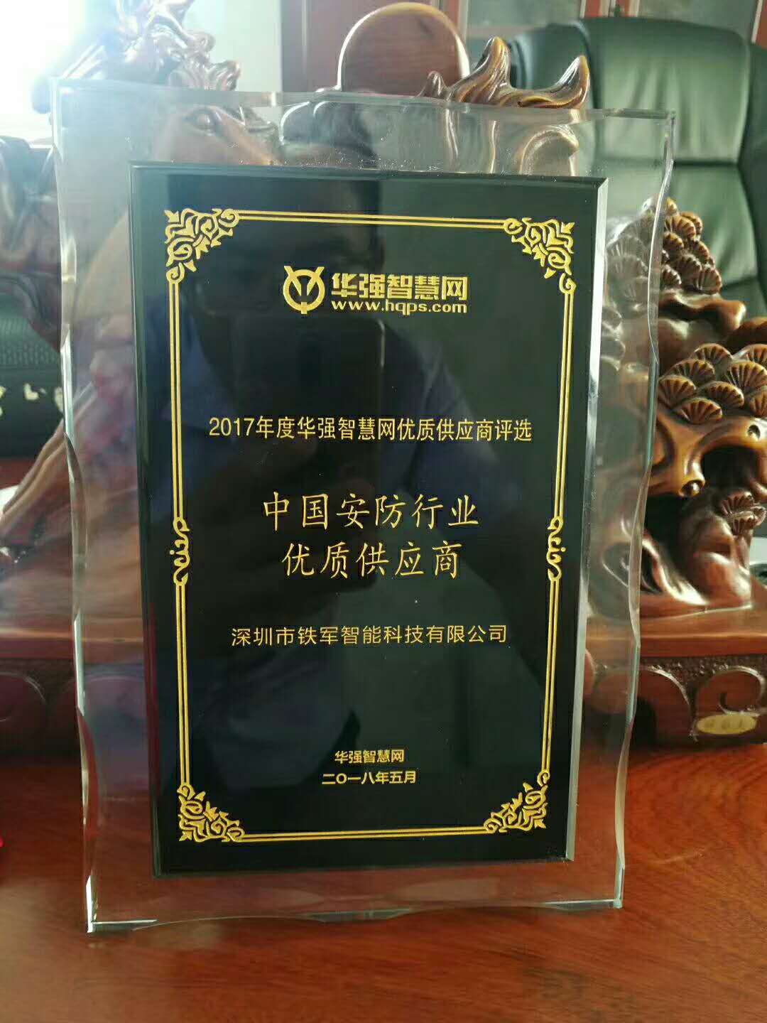 2018 年 5 月21日,鐵軍智能獲得由華強智慧網頒發的“2017年度中國安防行業優質供應商獎”。該獎項的授予為了表彰長期以來廣大客戶對鐵軍智能的信任和支持。銷售經理譚寧遠先生代表鐵軍智能領取了獎項。